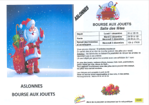 - Lundi 1, mardi 2 et mercredi 3 : bourse aux jouets – salle des fêtes